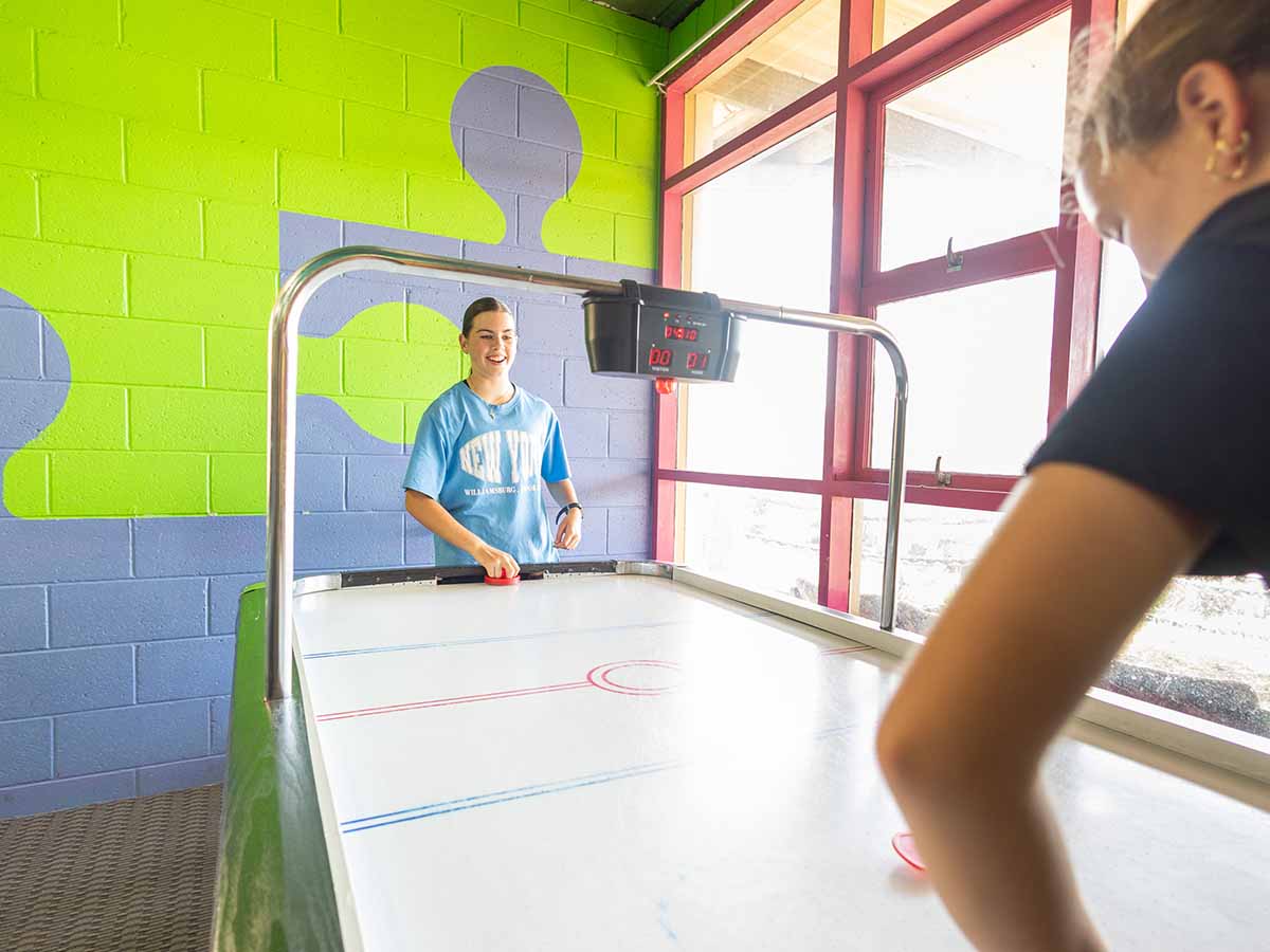 A large indoor activity space packed with energy, featuring rock climbing, pickleball, basketball and volleyball. Challenge your group with high-impact favourites like the Giant Swing and crate climb.Games Room